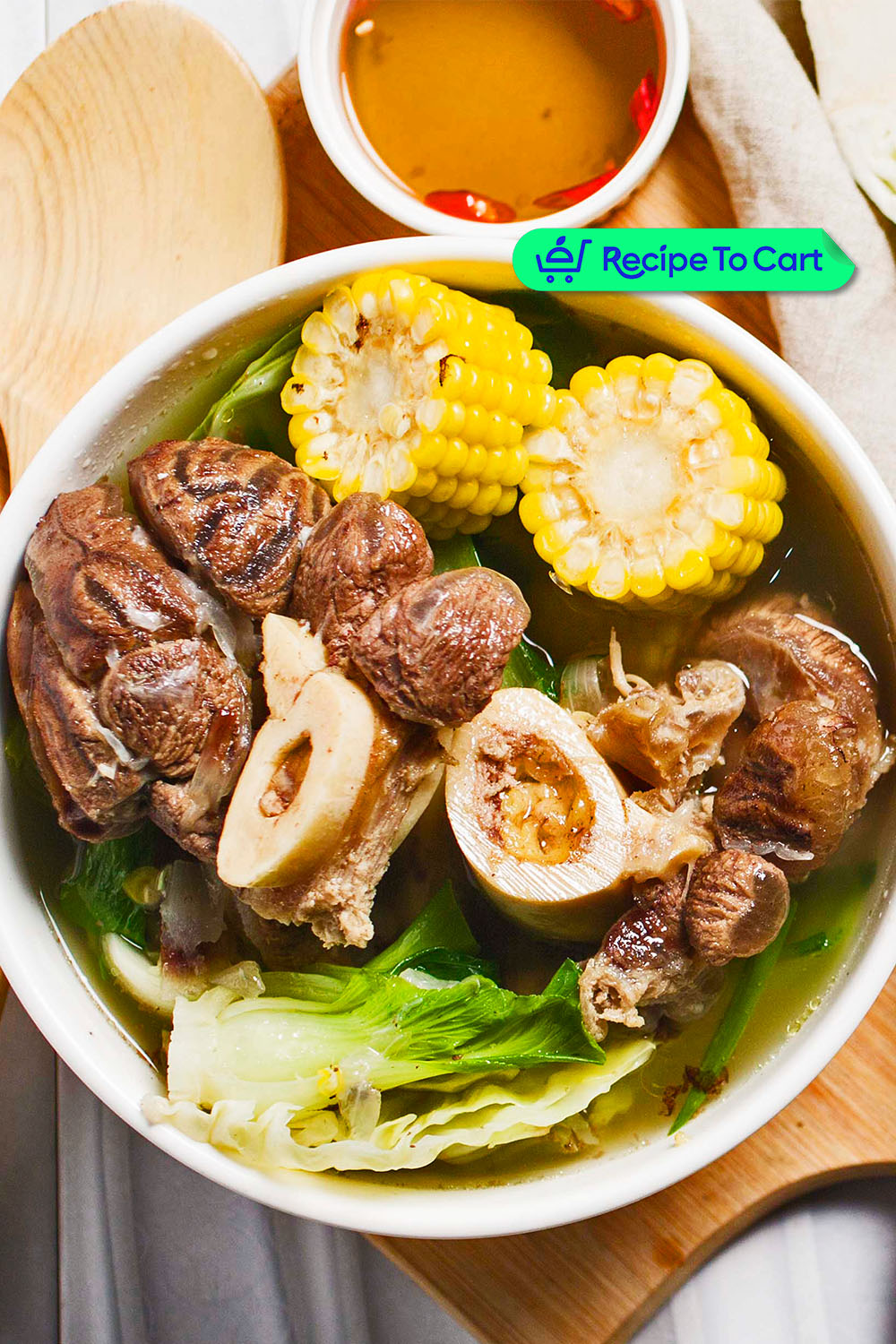 1. Combine meat, water, onions, whole pepper, and fish sauce. Allow to boil then cover and simmer over low heat for 2 to 3 hours or until meat is tender (or cook using a pressure cooker for about 30 minutes).