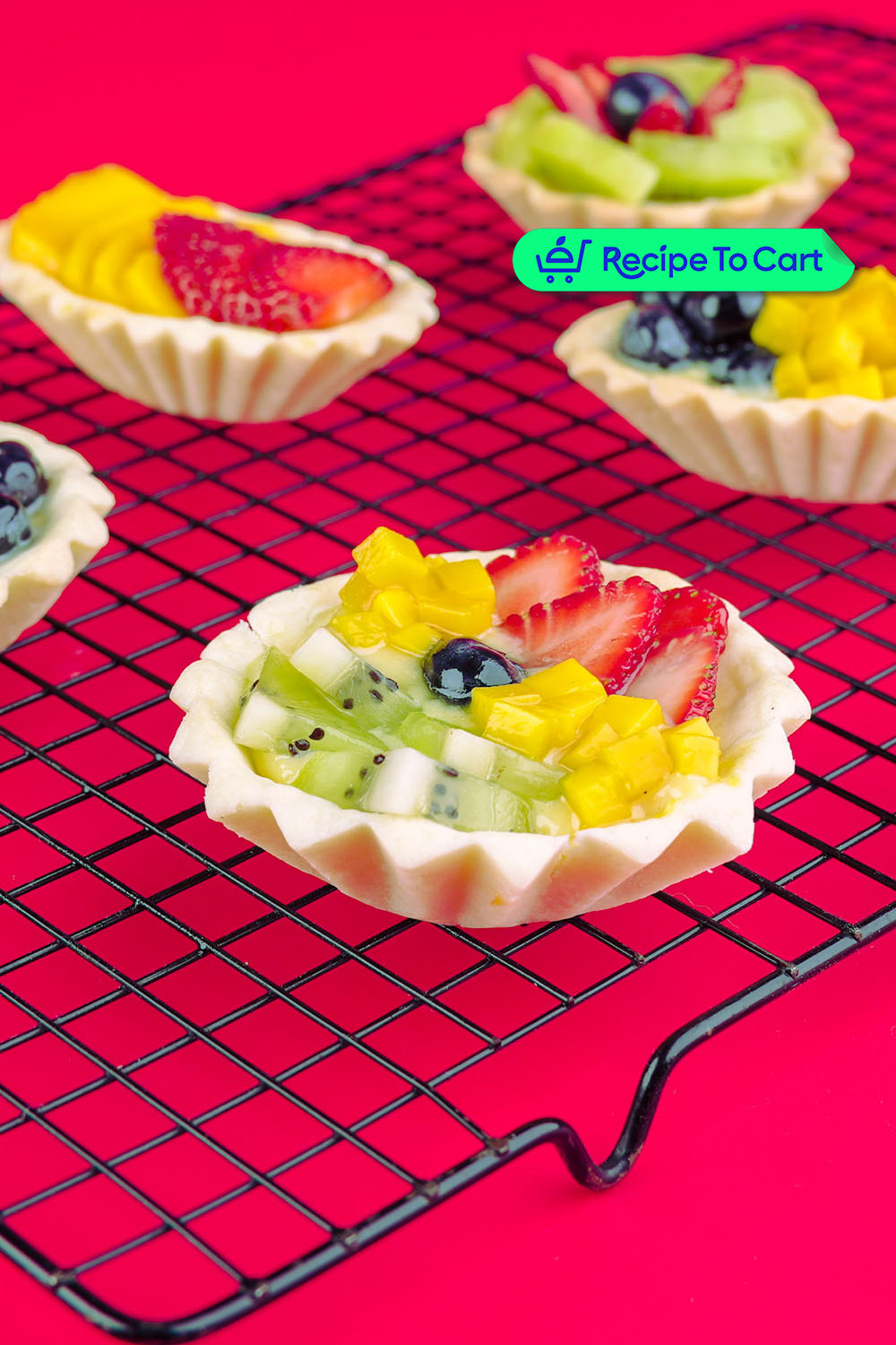 3. Pipe the filling onto the baked tart crusts and top with fresh fruit slices and brush with corn syrup.