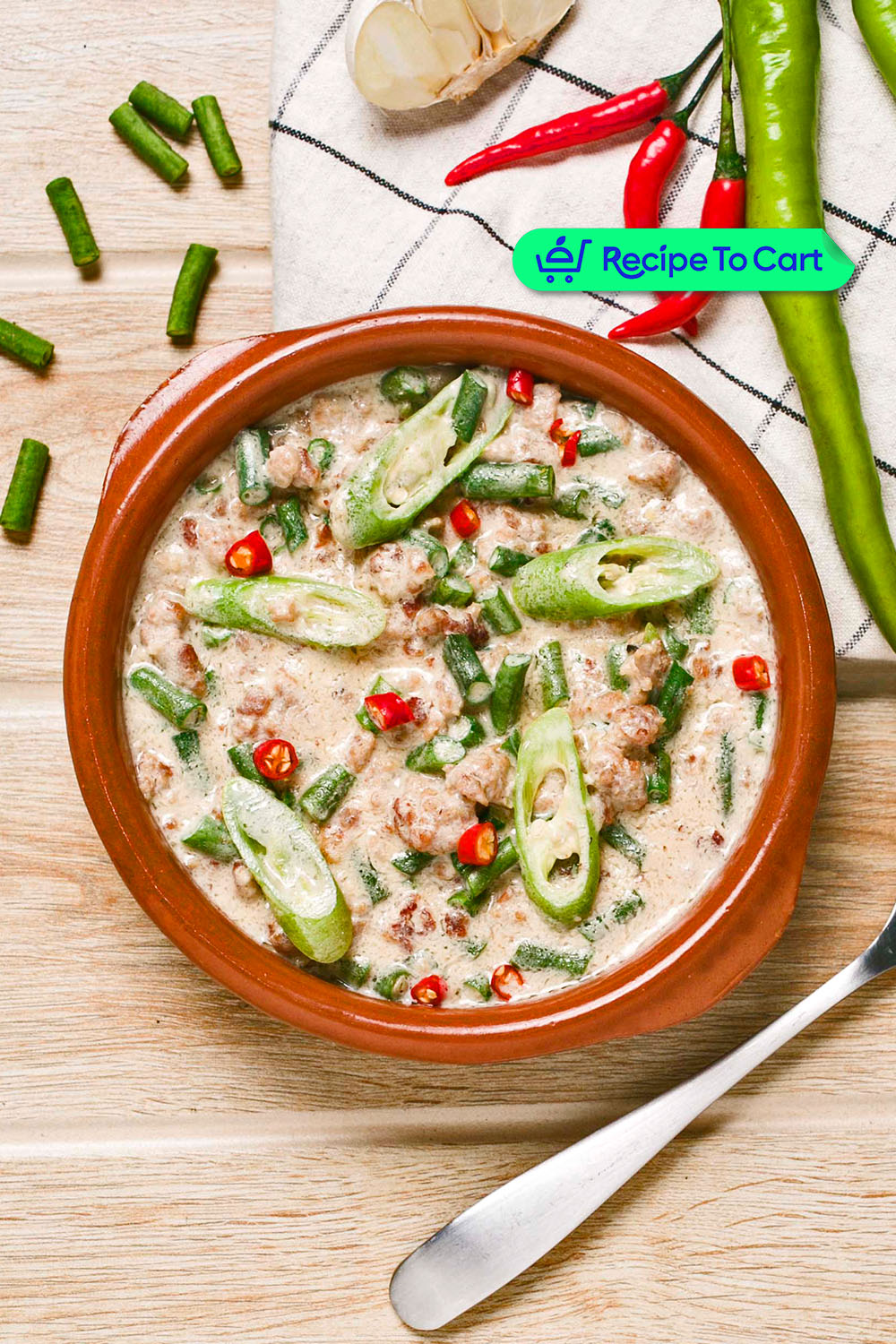 2. Add string beans, chili, and dissolved gata mix. Simmer uncovered, stirring occasionally, until sauce slightly thickens and cooked.