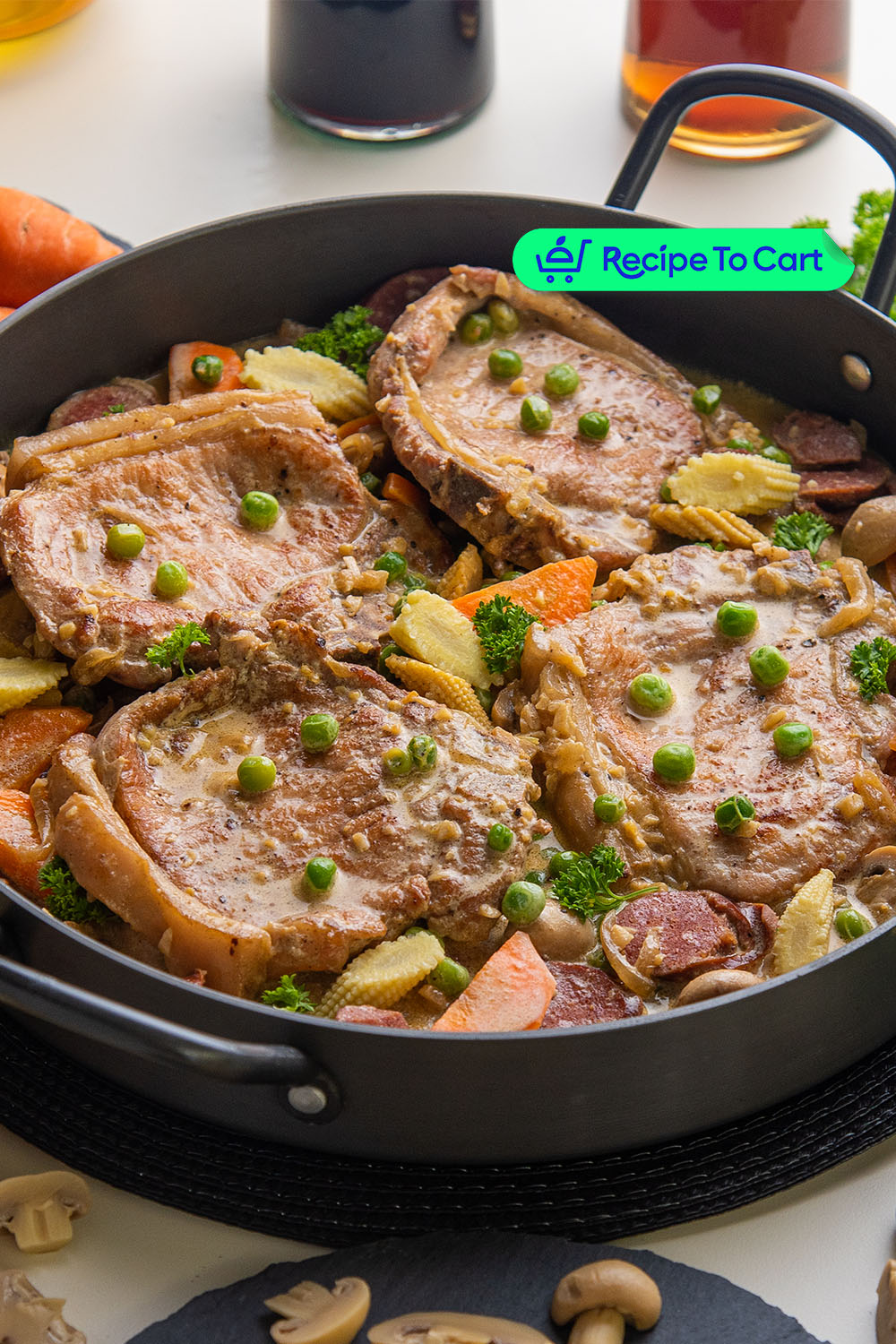 2. In the same pan, add butter. Sauté garlic, onion, carrot, chorizo, mushroom, young corn. Season with fish sauce. Cook for 2 minutes.