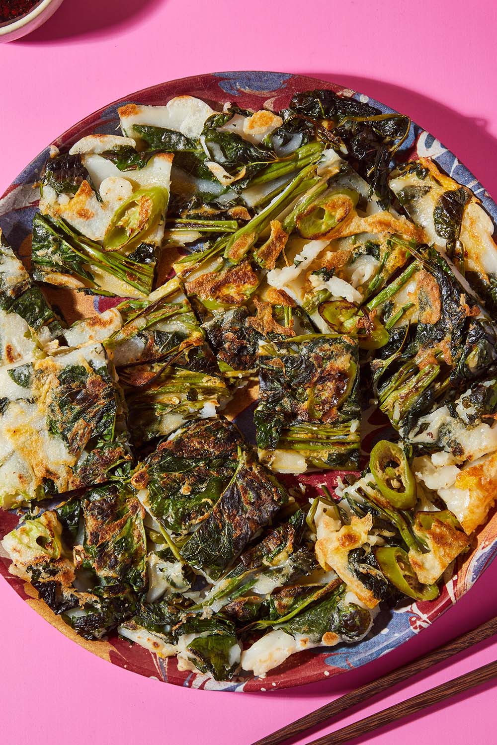 3. In the pan, arrange a thin layer of kangkong strips, enough to fit inside the pancake. Add sili, if using.