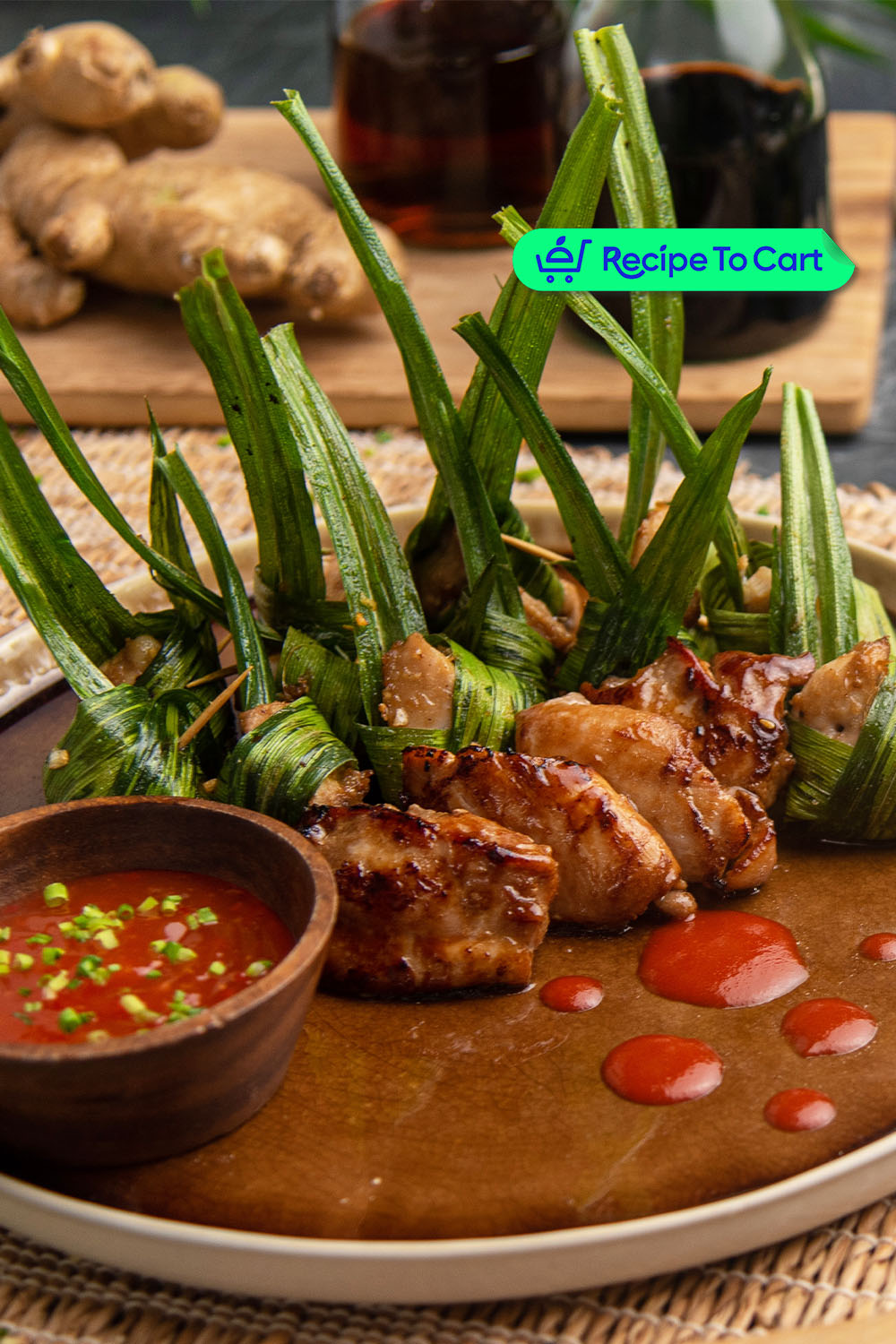 2. Wrap chicken pieces individually with pandan leaves and secure with toothpicks. Set aside.