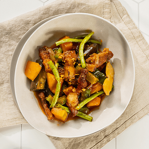 4. Add kalabasa, sitaw, eggplant, okra, and ampalaya. Cover and simmer for 20 minutes. Top with reserved fried pork before serving.