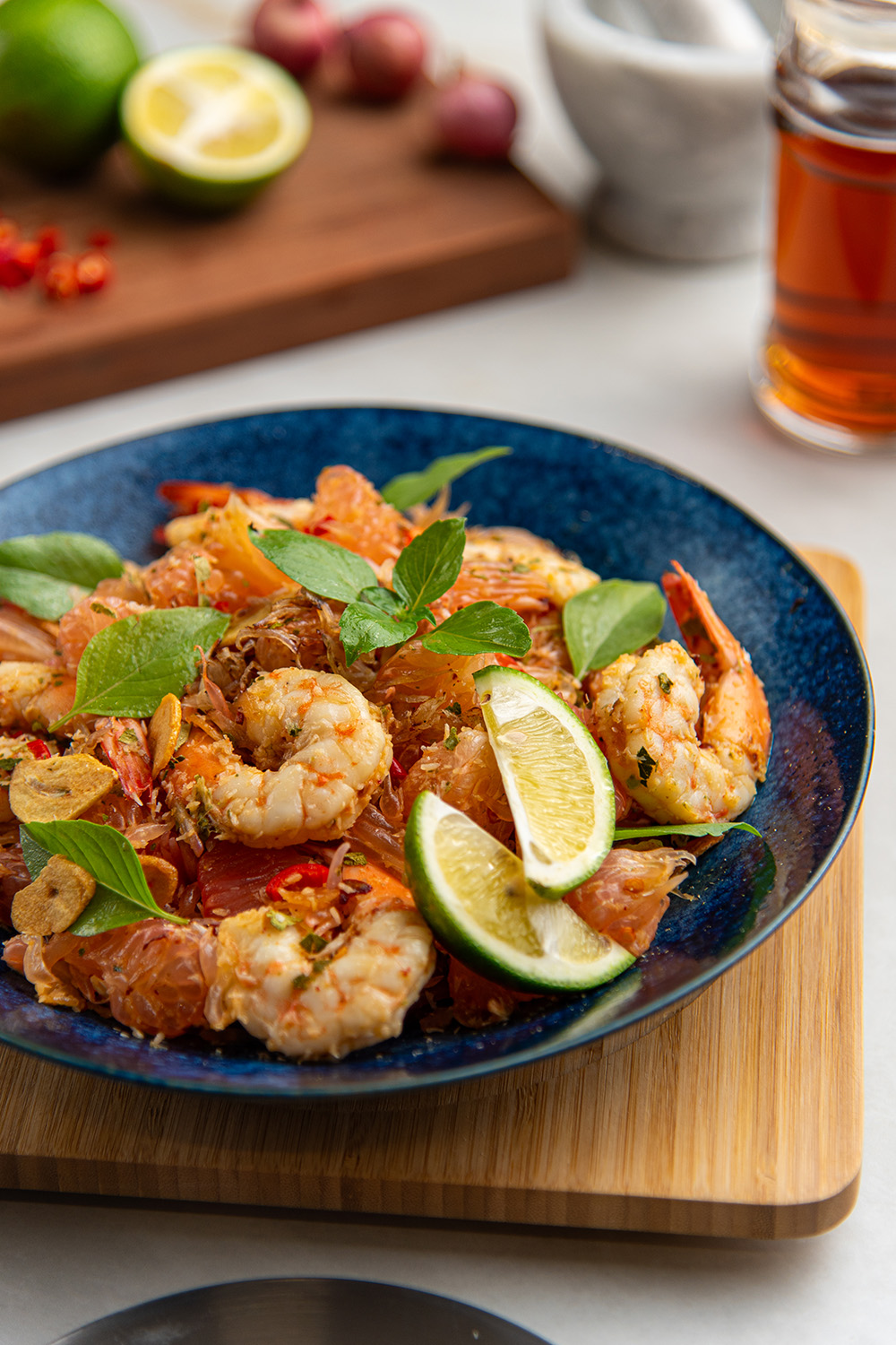 4. In the same bowl, add pomelo meat, poached shrimp and half portions of desiccated coconut, shallots, garlic, chili, and kaffir lime leaves. Mix until well-coated.