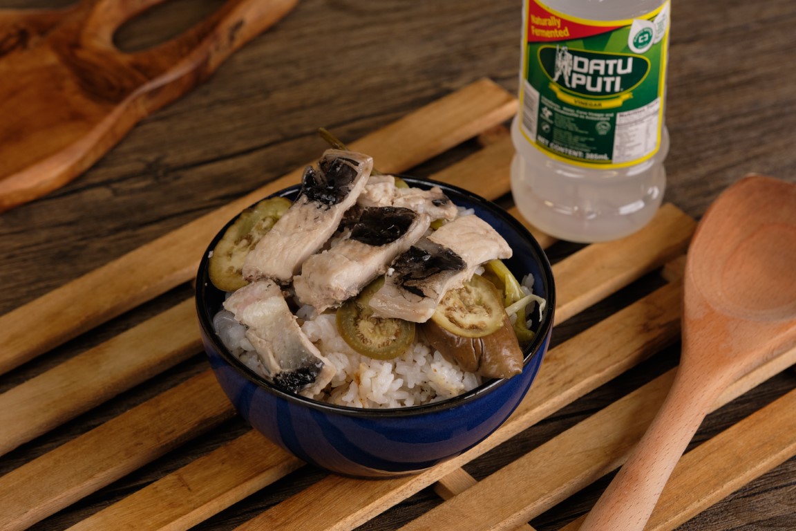 4. Arrange sliced milkfish belly fillet, eggplant, and chilli finger on top of the rice. Cover and allow to further cook for 7 minutes.