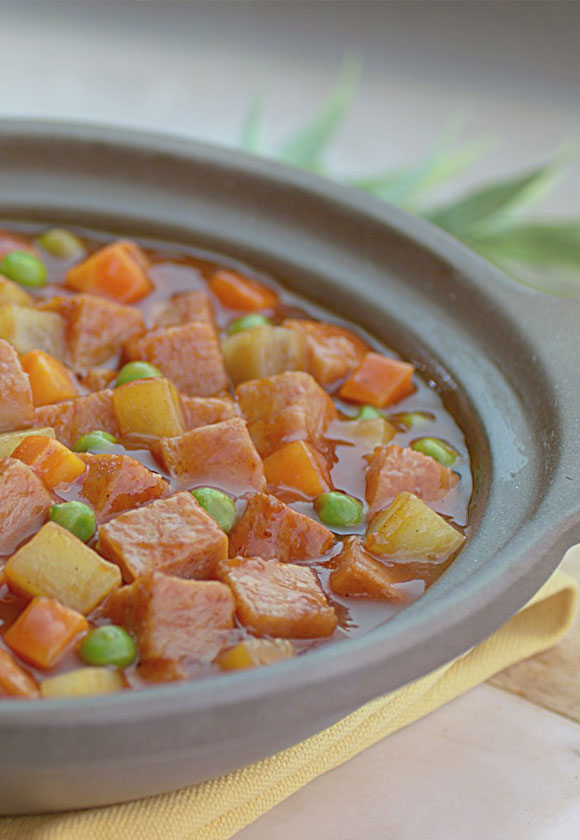 2. In the same pan, saute potatoes and carrot. Add UFC Readt Recipe Menudo Sauce and water. Cover and simmer over low heat for 5 minutes. Add luncheon meat. Simmer for another 5 minutes.